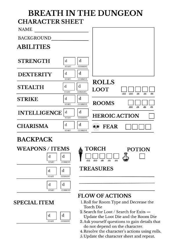 Breath in the Dungeon is a solo RPG in classic dungeon-crawl style, inspired by the darkness of old-school fantasy and driven by the Breathless engine—a system that ramps up tension, drains your resources, and never lets you feel safe.